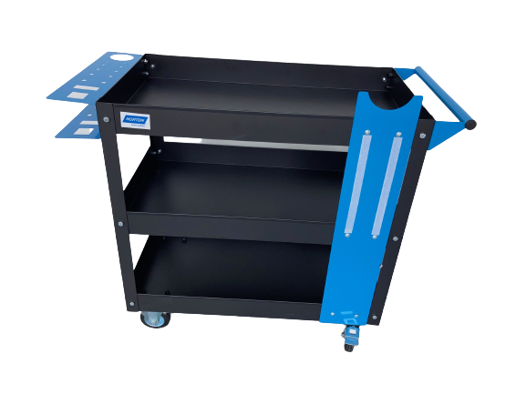 Praktikus munkaállomás, ahol a termékeket a javítási terület közelében tárolhatja .A fém kocsi hordozható különböző területekre való mozgatáshoz. Három polc tartozik a termék maximális tárolására, tépőzáras matrica a különbőző szemcséjű csiszolókorongok munka közbeni tárolására.